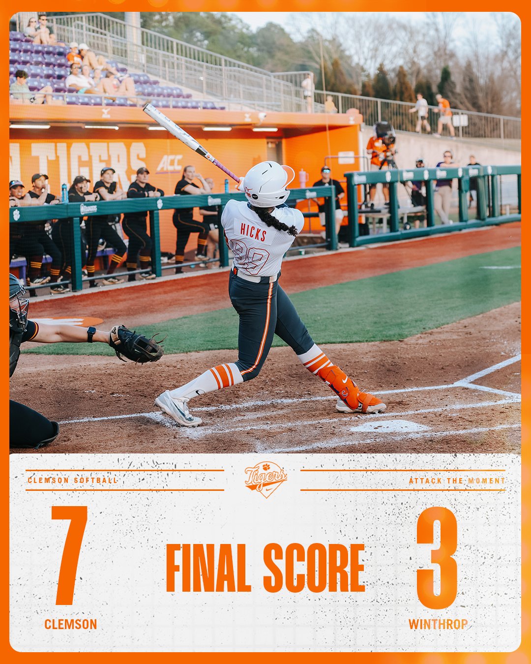 CLEMSON, S.C. – The No. 24/RV Clemson Tigers defeated Winthrop (14-12), 7-3, on Tuesday night in McWhorter Stadium to improve to 17-7 on the year. Sophomore