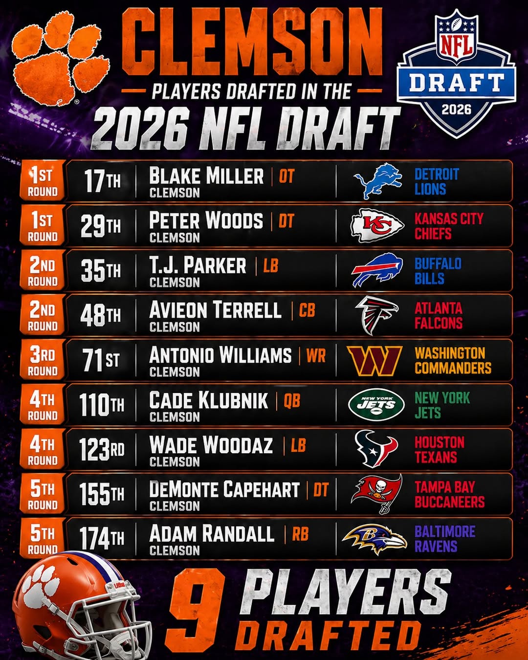 Clemson Matches Seven-Round School Record With Nine Selections in 2026 NFL Draft